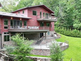 At ground level, a multi-level patio paved with custom-sculpted bluestone tiles is ready to accommodate outdoor grilling and kitchen facilities. The design of the patio levels allows for in-shade entertaining, quiet sunny lounging near the brook, or large-scale festivities that spill onto the rolling grass.